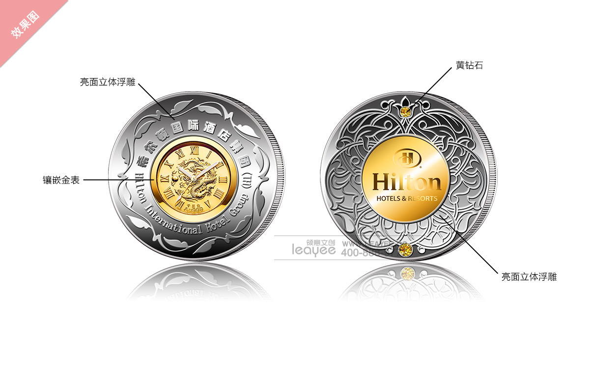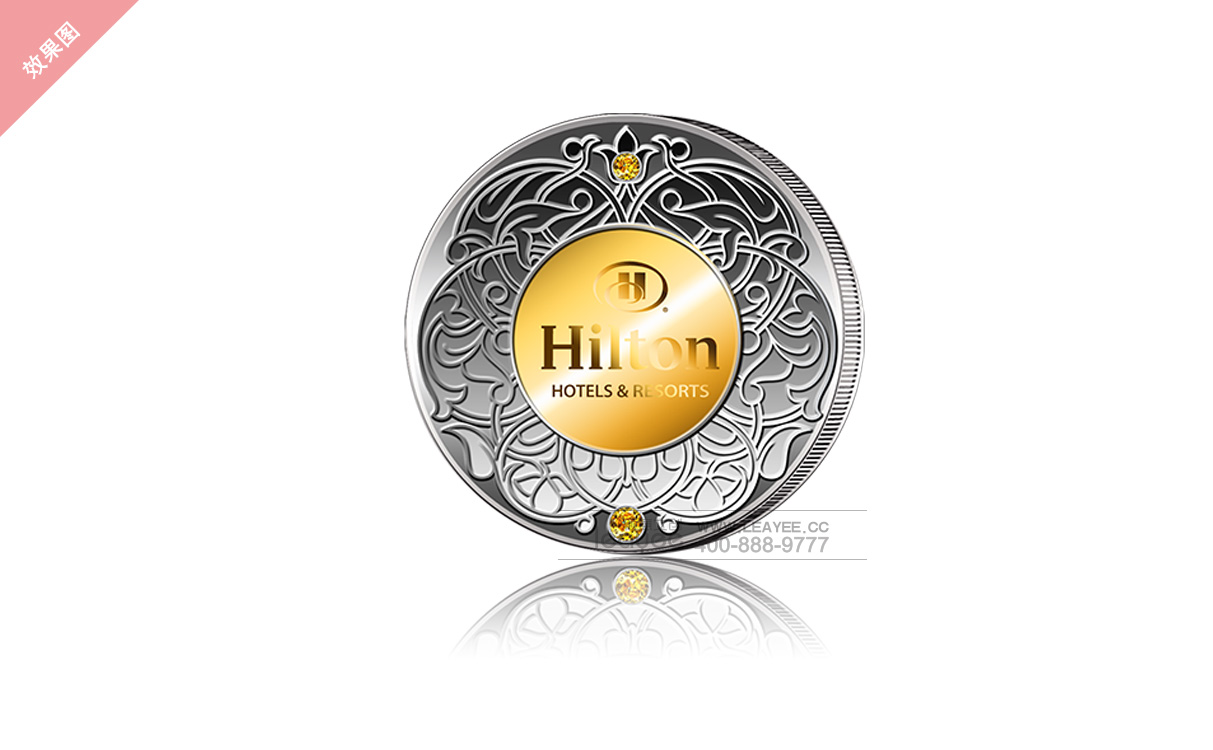 设计方案: 酒店创造“宾至如归”的文化氛围,注重企业员工礼仪的培养,并通过服务人员的“微笑服务”体现出来。客户在店一分钟,我们微笑一分钟,将纯金打造的时钟镶嵌在银币之中,在褒奖不断兢兢业业为希尔顿的发展做贡献的职务人员的同时,更是时刻提醒着时时微笑服务的酒店文化理念。而后才有了我们今天不断发展的成就。