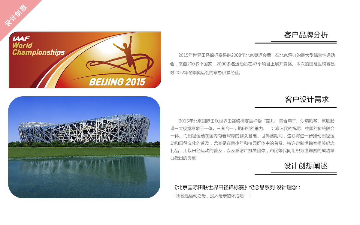 设计方案: 2015年北京国际田联世界田径锦标赛吉祥物“燕儿”集合燕子、沙燕风筝、京剧脸谱三大视觉形象于一体。三者合一,把田径的魅力、 北京人民的祝愿、中国的传统融会一体。而田径运动在国内有着深厚的群众基础,世锦赛期间,这必将进一步推动田径运动和田径文化的普及,尤其是在青少年和校园群体中的普及。特许定制世锦赛相关纪念礼品,用以田径运动的普及,以及感谢广机关团体,市民等民间组织为世锦赛的成功举办做出的贡献