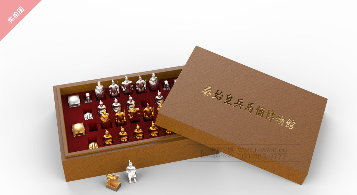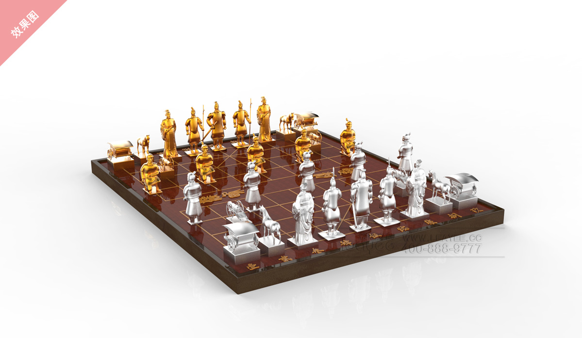 设计方案: 秦兵马俑场面宏大,威风凛凛,队列整齐,展现了秦军的编制、武器的装备和古代战争的阵法。显示了秦始皇威震四海、统一六国的雄伟军容,表现了极高的造型艺术,是世界上独一无二的文化艺术宝库。将其创造性的与中国象棋结合,更是将古代厮杀凛冽,威武雄壮的场景再现于现实生活中,一显中国军事之风采。