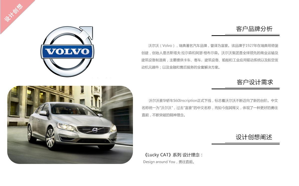 设计方案: 沃尔沃豪华轿车S60Inscription正式下线,标志着沃尔沃不断迈向了新的台阶。中文名称统一为"沃尔沃",过去"富豪"的中文名称,而如今指其释义,体现了一种更好的勇往直前,不断突破的精神理念。