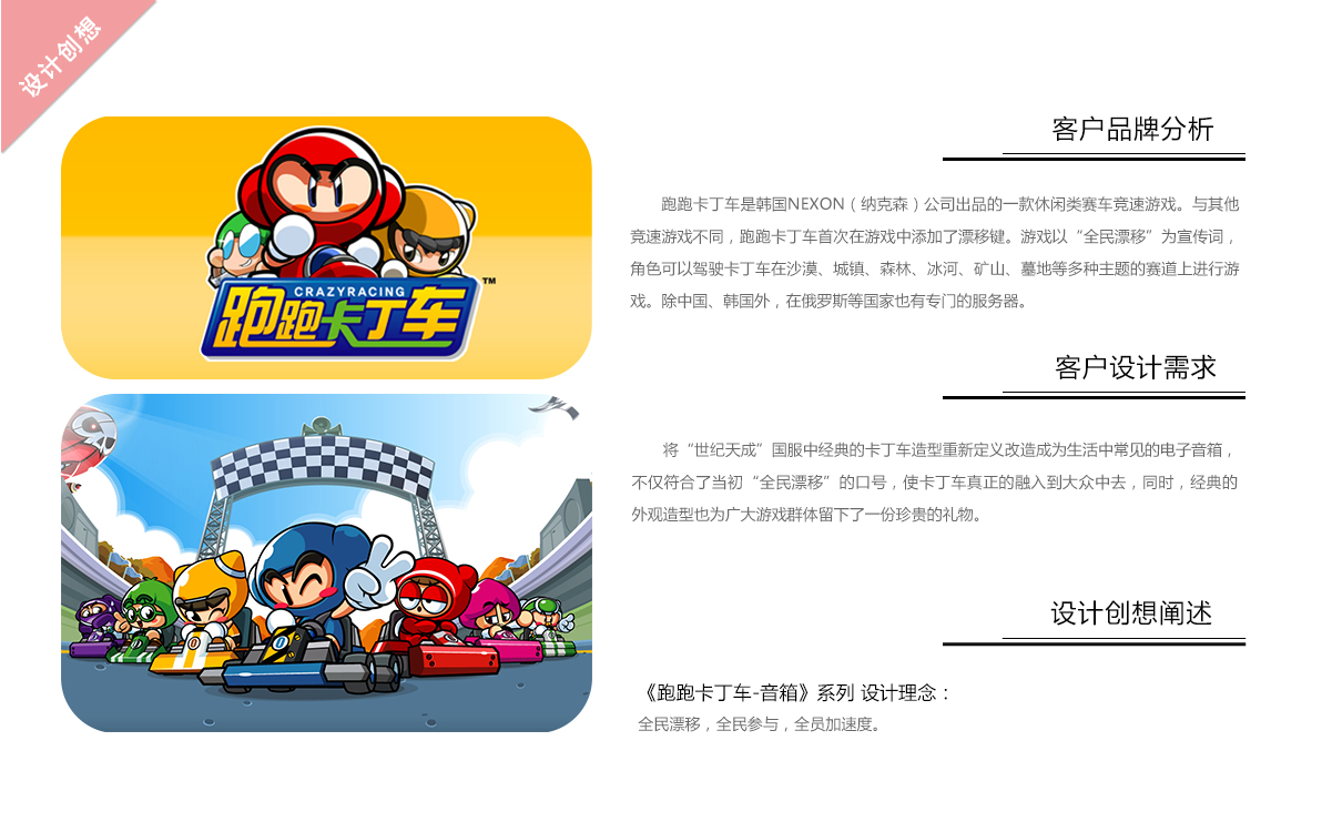 设计方案: 将“世纪天成”国服中经典的卡丁车造型重新定义改造成为生活中常见的电子音箱,不仅符合了当初“全民漂移”的口号,使卡丁车真正的融入到大众中去,同时,经典的外观造型也为广大游戏群体留下了一份珍贵的礼物。