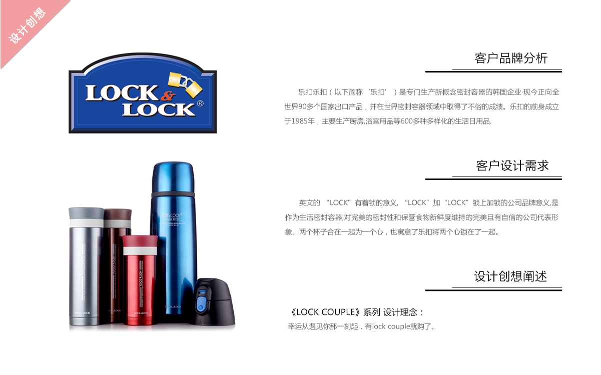 设计方案: 英文的 “LOCK”有着锁的意义, “LOCK”加“LOCK”锁上加锁的公司品牌意义,是作为生活密封容器,对完美的密封性和保管食物新鲜度维持的完美且有自信的公司代表形象。两个杯子合在一起为一个心,也寓意了乐扣将两个心锁在了一起。