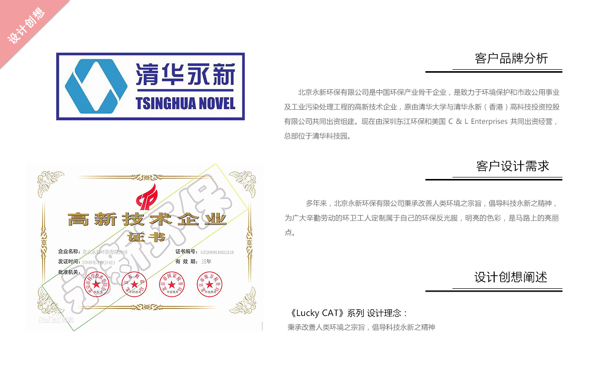 设计方案: 多年来,北京永新环保有限公司秉承改善人类环境之宗旨,倡导科技永新之精神,为广大辛勤劳动的环卫工人定制属于自己的环保反光服,明亮的色彩,是马路上的亮丽点。