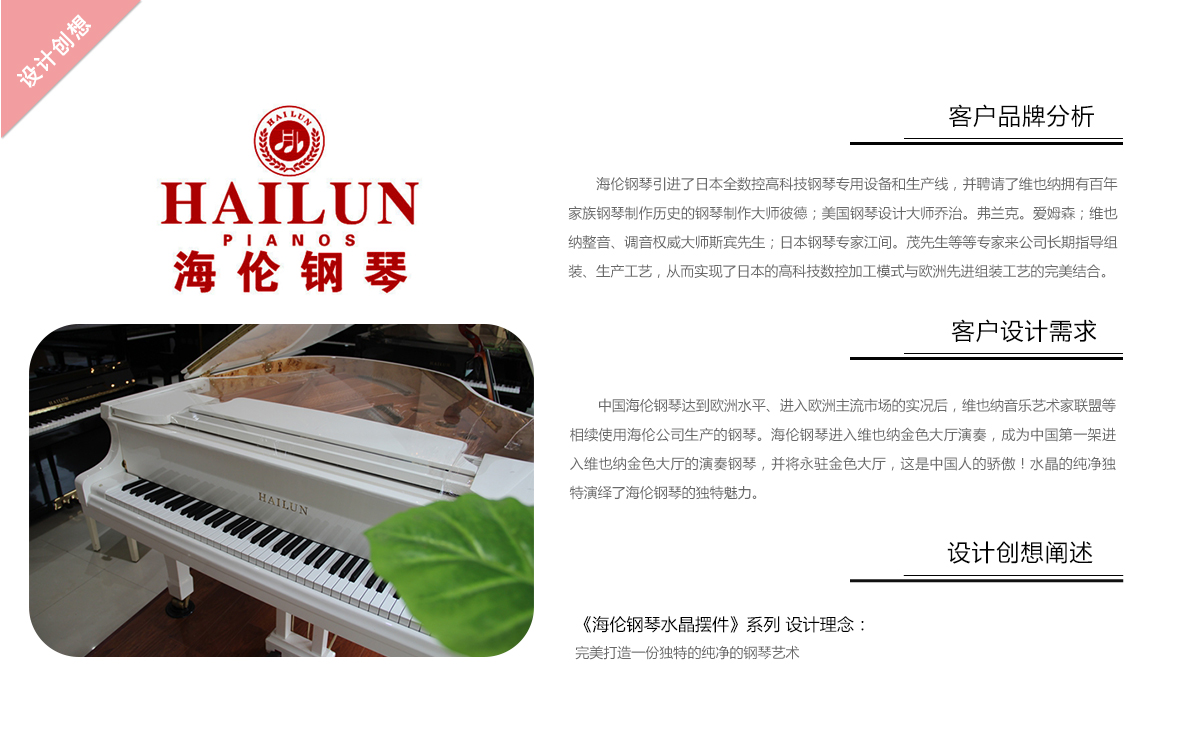 设计方案: 中国海伦钢琴达到欧洲水平、进入欧洲主流市场的实况后,维也纳音乐艺术家联盟等相续使用海伦公司生产的钢琴。海伦钢琴进入维也纳金色大厅演奏,成为中国第一架进入维也纳金色大厅的演奏钢琴,并将永驻金色大厅,这是中国人的骄傲!水晶的纯净独特演绎了海伦钢琴的独特魅力。