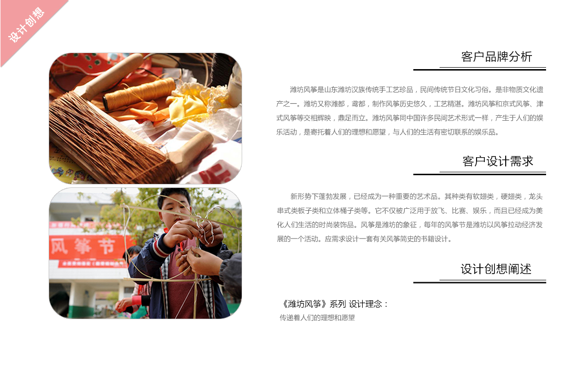 设计方案: 在新形势下蓬勃发展,已经成为一种重要的艺术品。其种类有软翅类,硬翅类,龙头串式类板子类和立体桶子类等。它不仅被广泛用于放飞、比赛、娱乐,而且已经成为美化人们生活的时尚装饰品。风筝是潍坊的象征,每年的风筝节是潍坊以风筝拉动经济发展的一个活动。应需求设计一套有关风筝简史的书籍设计。